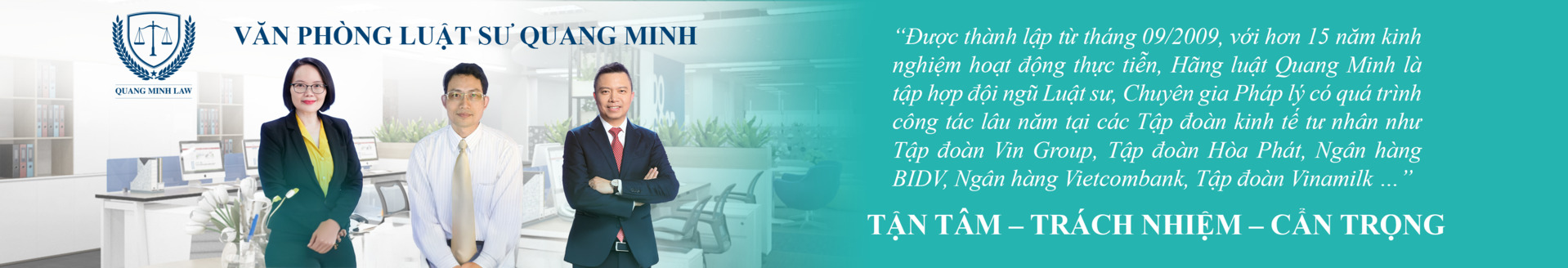 “Được thành lập từ tháng 09/2009, với hơn 15 năm kinh nghiệm hoạt động thực tiễn, Hãng luật Quang Minh là tập hợp đội ngũ Luật sư, Chuyên gia Pháp lý có quá trình công tác lâu năm tại các Tập đoàn kinh tế tư nhân như Tập đoàn Vin Group, Tập đoàn Hòa Phát, Ngân hàng BIDV, Ngân hàng Vietcombank, Tập đoàn Vinamilk...