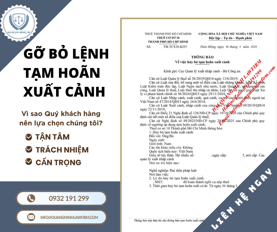 Quý khách hàng quan tâm đến thủ tục hỗ trợ Gỡ bỏ lệnh tạm hoãn xuất cảnh khi chưa hoàn thành nghĩa vụ thuế vui lòng liên hệ Công ty Luật Đại Quang Minh theo số Zalo/Hotline: 0932.191.299 để được hỗ trợ miễn phí, trọn gói nhanh chóng, chính xác nhất.
