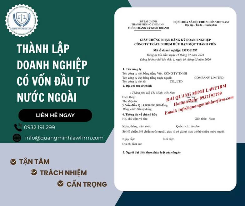 Quý khách hàng quan tâm đến thủ tục hỗ trợ Thành lập doanh nghiệp có vốn đầu tư nước ngoài vui lòng liên hệ Công ty Luật Đại Quang Minh theo số Zalo/Hotline: 0932.191.299 để được hỗ trợ miễn phí, trọn gói nhanh chóng, chính xác nhất.