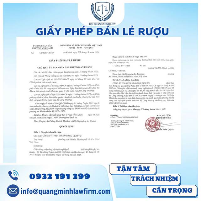 Quý khách hàng quan tâm đến thủ tục xin cấp Giấy phép bán lẻ rượu vui lòng liên hệ Công ty Luật Đại Quang Minh theo số Zalo/Hotline: 0932.191.299 để được hỗ trợ miễn phí, trọn gói nhanh chóng, chính xác nhất.